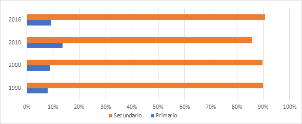 Si bien es cierto que el rezago social del estado es el más alto a nivel nacional (CONEVAL, 2015), ha bajado en tiempos recientes, aunque sigue ocupando los primeros lugares por edades en el país, en menores de 6 años (6.9%), menores de 14 años (14.84%) y mayores de 15 años (53.25%)3 (CONEVAL, 2015). Otro dato interesante es que la población en Chiapas continúa trabajando aún después de los 65 años, pues en el año 1990 solamente 4.1% de esa población se encontraba ocupada, mientras que en 2010 representaba 5.3% del total de los ocupados. En el caso chiapaneco, el segmento primario avanzó de 8% a 14% de 1990 a 2010 (INEGI, 2010), pero se redujo en 2016 a 9%, mientras que el secundario también bajó en un 4% en 2000, regresando a los parámetros de 1990, cuando quienes se ocupaban en este sector fueron absorbidos por el sector primario, que pasó a albergar 90% de la población ocupada (PO) durante ese año. En 2010 se situó en 86%, y regresó a 91% en 2016, como se ve en la Gráfica 3. En parte este retroceso, o bien reacomodo, de las fuerzas laborales en los segmentos primarios tiene que ver con el éxodo masivo que muchas comunidades chiapanecas experimentaron en décadas recientes.