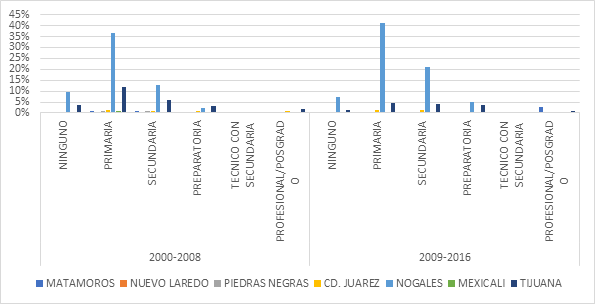 Estas características de bajo perfil educativo y escasa experiencia laboral contribuyen a la vulnerabilidad laboral. Como indica Garza, la probabilidad de ser pobre en zonas urbanas fronterizas para un hogar cuyo jefe ha completado la educación secundaria es de 55%, porcentaje inferior a la de un hogar cuyo jefe no tiene instrucción, por lo que el patrón de precariedad está aunado a la educación. De igual forma, la pobreza es mayor en los hogares cuyo jefe es trabajador agrícola, ambulante u obrero no calificado (Garza, 2016).