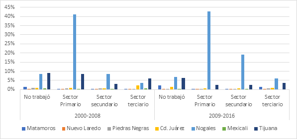 Como sugiere De Ibarrola (2010), se espera que quienes interrumpen sus estudios en el transcurso del año escolar sean menos propensos a volver a clases el año siguiente. En México, 26% de los jóvenes que deja sus clases entre los 12 y los 16 años, principalmente por motivos como el trabajo o el apoyo en la casa, ya no regresa. Así, el flujo migratorio de los chiapanecos hacia el norte se caracteriza por que cuentan con algún tipo de experiencia laboral, pues para el primer periodo, 78% (EMIF, 2000-2008) declaró haber trabajado en su lugar de origen, cifra que aumentó a 86% en el segundo periodo (EMIF, 2009-2016). El principal sector de la actividad económica en el que tenían experiencia laboral los migrantes chiapanecos era el primario, el cual engloba las actividades relacionadas con agricultura, ganadería, pesca y silvicultura; 52% del total contaba con experiencia migratoria durante el periodo 2000-2008, y 48% según datos de la EMIF 2009-2016 . El segundo sector engloba a los trabajadores en manufactura, minería, actividades extractivas, generación de energía y construcción; los migrantes chiapanecos aumentaron 10% su participación en actividades relacionadas con este sector entre periodos (EMIF, 2000-2016), pues pasaron de 13% a 23% del total (véase Gráfica 7).
