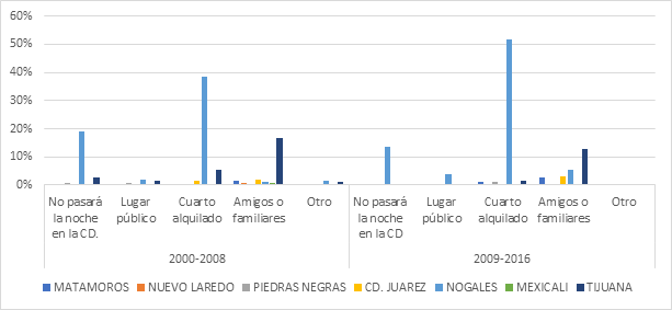 No obstante, al observar estos datos de cerca, los entrevistados que declararon pernoctar en casa de amigos o familiares en Nogales pasaron de ser 2% a 10% entre los periodos 2000-2008 y 2009-2016, lo cual indica que la ciudad se encuentra en proceso de convertirse en un destino final, o cuando menos de temporadas de estancia más largas para los migrantes chiapanecos durante el periodo de análisis. Asimismo, que las redes sociales migratorias ancladas en la ciudad muestran un proceso de consolidación (véase Gráfica 8).