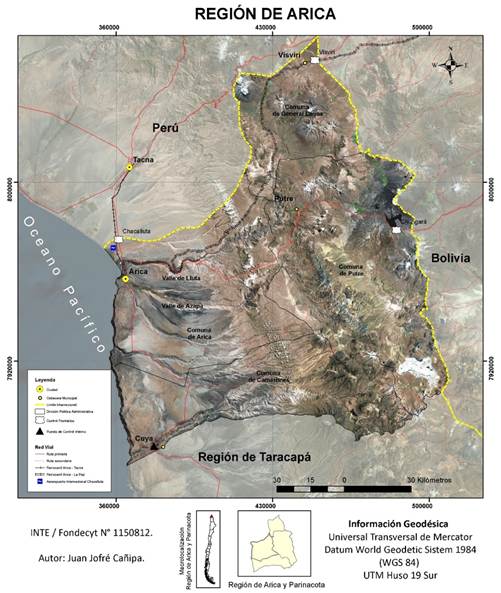 El extremo norte de Chile -ahí donde comparte fronteras con Perú y Bolivia- está constituido por la región administrativa de Arica y Parinacota, el último territorio formalmente incorporado a Chile en 1929 como botín de la Guerra del Pacífico (1879-1883). Su cabecera es la ciudad de Arica, que, según el último censo (2017) tenía 221 548 habitantes, casi el 99% de la población total de la región que encabezaba. El 26% de su población alegaba pertenencias a pueblos originarios, principalmente aimaras.