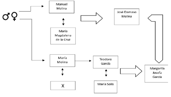 De acuerdo con las informaciones levantadas por el cura, José Dámaso Molina era primo hermano del papá de Margarita Josefa García, es decir, tío segundo de su pretendida (véase Figura 1). Por dichas informaciones podemos saber, además, que en el momento en que inició la relación José no sabía si eran parientes, ya que se enteró cuando les comunicó a sus padres que quería casarse, y que, si bien él la pretendía, era porque «con esta hizo su primer trato, y que siendo pobre y huérfana será avenible y buena esposa».37 En esa expresión se puede advertir que en realidad José era muy joven y que había ofrecido sus primeros esponsales de matrimonio con Margarita.