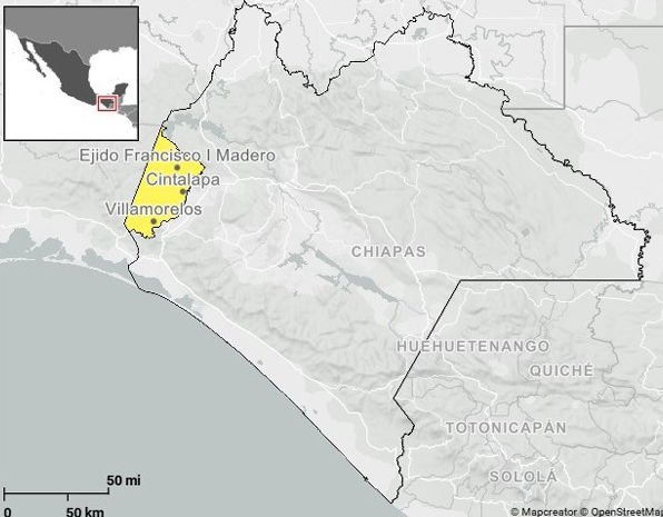 El estudio se realizó en Cintalapa, municipio ubicado en el extremo oeste de Chiapas, en la región de los Valles Centrales. La información que se presenta se recabó en dos ejidos, Francisco I. Madero y Villamorelos, que se encuentran en diferentes puntos altitudinales (véase mapa 1). Fisiográficamente, el municipio se divide en valles con lomeríos (41.15 %) y sierras (57.95 %). En cuanto al clima, predomina el ambiente cálido subhúmedo con lluvias en verano, con temperaturas que oscilan entre los 22 y 26 °C y precipitaciones que van desde los 800 a los 2 300 milímetros, dependiendo de la zona (INEGI, 2022).