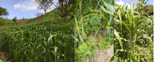 En estas seis parcelas se implementa un agroecosistema base que consiste en la asociación de maíz, calabaza de año (Cucurbita moschata), pumpo, tarro (Lagenaria siceraria) y frijol de guía andalón (Vigna Unguiculata). El frijol andalón, cuyo nombre alude a su forma de crecimiento, extiende sus guías hasta por cinco metros dentro de la milpa y sirve como cobertura vegetal para el suelo.