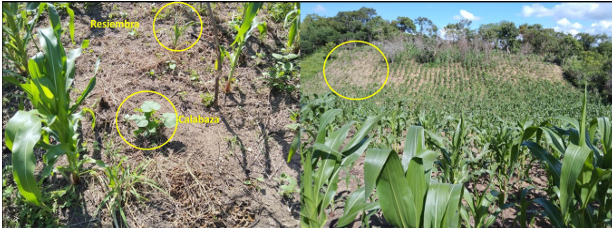 En esta parcela, junto al cultivo de maíz prosperan arvenses de hoja ancha y zacates, cuya limpia se hace con la coa, con lo cual se minimiza el uso de herbicidas tóxicos. Esta práctica permite aprovechar las arvenses de uso alimenticio tales como hierba mora, tomatillo de rastrojo y bledo. Esta parcela rindió una cosecha de aproximadamente de 1.2 toneladas de maíz, alrededor de 200 calabazas y 15 kilos de frijol.4