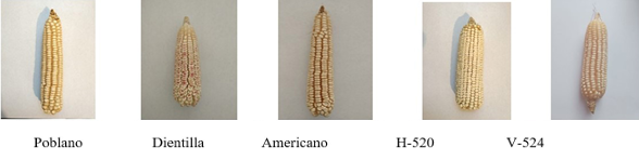 Don Chepe cultiva en sus nueve milpas maíces nativos y acriollados (véase imagen 7). Entre los nativos destacan el poblano, el dientilla y el americano, cuyas mazorcas presentan un olote delgado y un promedio de 8 a 10 hileras con granos blancos, o blancos con tono morado en el caso del dientilla. Aunque un estudio previo los ubica dentro del complejo tuxpeño (Martínez-Sánchez, Espinosa-Paz y Cadena-Íñiguez, 2017), sus características morfológicas sugieren una mayor afinidad con la raza olotillo, caracterizada por mazorcas delgadas con un máximo de 10 hileras de granos.
