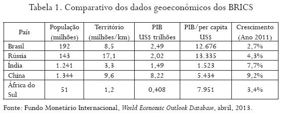 A análise atual das relações internacionais confirma que o BRICS formado por Brasil, Rússia, Índia, China e África do Sul representa muito mais do que um jogo fonético de letras para indicar países emergentes com expressivas taxas de crescimento. O acrônimo criado por Jim O'Neill foi transformado em motivação de esforços diplomáticos e iniciativas comerciais. Gradualmente, tornou-se objeto de análise, despertando interesse não apenas acadêmico, mas também no âmbito da política internacional.