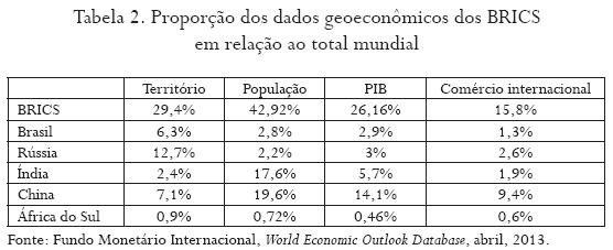 Em 2012, a soma dos produtos internos brutos (PIB) dos cinco países9 atingiu US$ 15 trilhões, o que representa cerca de 21% do PIB mundial em valores nominais e 27% do PIB mundial em termos de paridade de poder de compra. Os membros ocupam aproximadamente 29% da área terrestre do planeta, abrigam 42% da população mundial e detêm 45% de força de trabalho global. O comércio entre os países do BRICS alcançou US$ 282 bilhões em 2012 ante o valor de US$ 27 bilhões dez anos atrás. Há estimativas de que possa chegar a mais de US$ 500 bilhões até 2015. Já o comércio Brasil BRICS passou de US$ 7,6 bilhões em 2002 para US$ 91 bilhões em 2012 um aumento de mais de 1000%.10