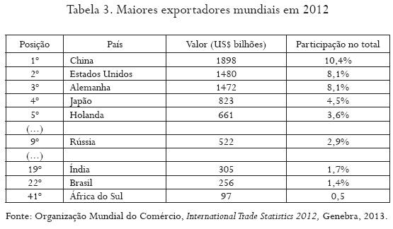O outro país a se aproximar dessas cifras é a Rússia, que figura na 9ª posição entre os maiores exportadores mundiais. Em 2011, o país exportou US$ 522 bilhões. Em dez anos, os russos multiplicaram suas exportações por 3,8 e suas importações por 5,3. Esse aumento tem a crescer devido à acessão russa à OMC.14 A Índia exportou US$ 305 bilhões e figura na 19ª posição exportadora, representando 1,7% do fluxo internacional. Em dez anos, as exportações aumentaram 5,2 vezes e as importações 6,2 vezes.