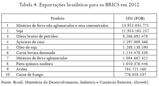 A análise da balança comercial brasileira,17 de 2011 a 2012, entre o Brasil e os outros BRICS, revela forte componente de recursos naturais, com a exceção de aeronaves, no comércio com a China e com a Índia, e de tratores, no comércio com a Rússia e com a África do Sul. Em relação à China, soja e minério de ferro correspondem à metade do valor exportado pelo Brasil. Para a Índia, cobre e óleo de soja são quase 40% das exportações brasileiras. As exportações para a Rússia são, predominantemente, de carne bovina e de açúcar. No caso sul-africano, verifica-se a exportação de veículos e tratores, além de carne de frango e minérios. Em todos os casos, a soma dos dez principais produtos corresponde a percentual bastante elevado da exportação, o que revela uma pauta pouco diversificada.18