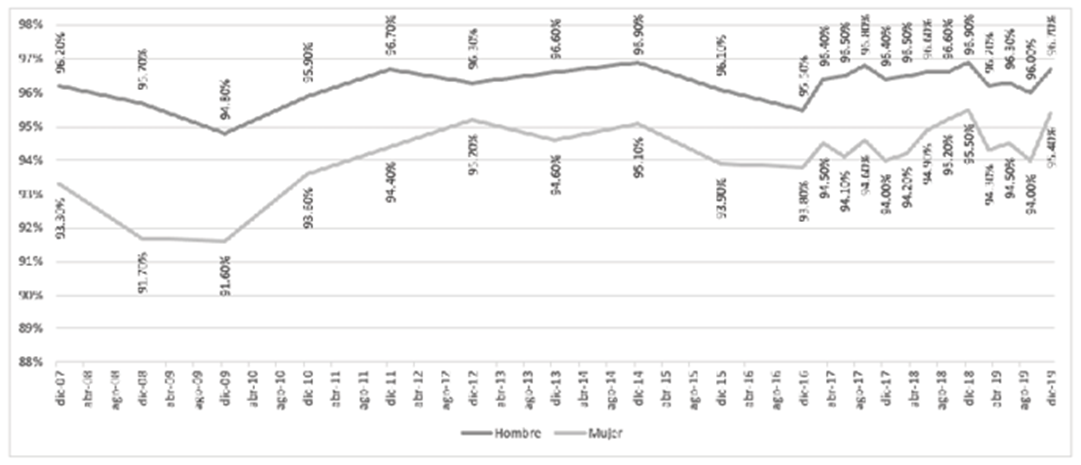 Para el año 2010, los hombres se ubicaron en el 95.9%, pero, la tasa de las mujeres se ubicó en un 93.6%, siendo ésta 2.3 puntos porcentuales menor que la de los hombres. En lo correspondiente a la tasa de empleo, existe una mejoría para diciembre de 2019 en donde se reduce a 1.3 puntos porcentuales, ubicándose en 96.7% para los hombres y 95.4% para las mujeres.
