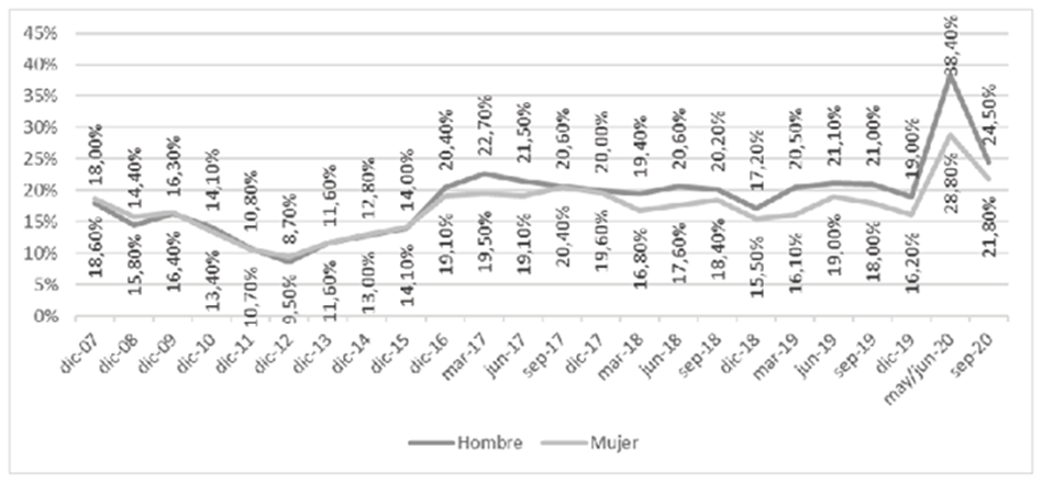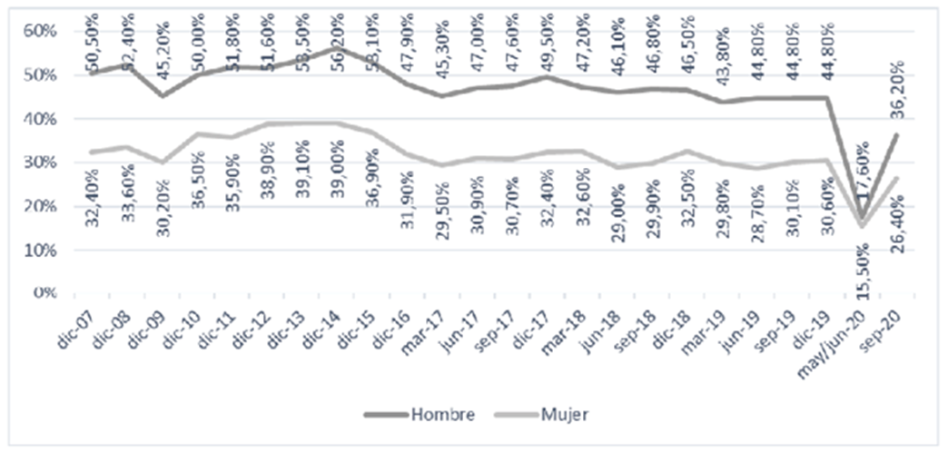 Ahora bien, si se tiene en cuenta el contexto de la pandemia, en septiembre de 2020 (con una muestra menor a periodos anteriores a la pandemia) la tasa de los hombres con empleo adecuado/pleno cae a un valor del 36.20%, y las mujeres cuentan con una tasa del 26.40% el cual es un valor en extremo reducido; en este caso, la diferencia porcentual entre sexos es de casi diez puntos.
