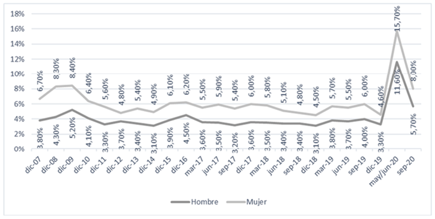 Mientras la pandemia continúe y las medidas de aislamiento se apliquen, el efecto del desempleo seguirá incrementándose.59 En cuanto a las cifras de desempleo, el gráfico 6 nos señala que, en diciembre de 2010, las mujeres tuvieron una tasa de desempleo del 6.4%, mientras que los hombres una tasa del 4.1%; estos 2.3 puntos porcentuales de diferencia se mantienen aún diez años después y en contexto de pandemia; cabe señalar que entre 2011 y 2019, la diferencia entre sexos se mantuvo en promedio en un valor inferior a los dos puntos porcentuales: su interpretación es que esta tasa sufrió un impacto negativo en la brecha entre sexos debido a la pandemia sufrida a nivel mundial.