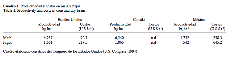 Un estudio realizado por el Congreso de los Estados Unidos (United States Congress, 1994) comparó la productividad entre los Estados Unidos, Canadá y México para los cultivos de maíz y fríjol. Este estudio consideraba también el equilibrio inestable del desarrollo tecnológico combinado con los factores del clima agrícola, y encontró que las tasas de productividad por hectárea de maíz y frijol y sus costos en dólares son las del Cuadro 1.