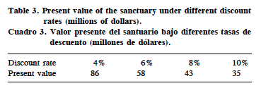 Hanemann (1989) shows that with a linear utility difference model with unrestricted mean and median the WTP (willingness to pay) of a trip with different levels of entrance fee would be: WTP(TC+EF)=(ß0+ß2(I))/ß1. Using the above formula, the value of the consumer surplus per person was found at 35.45 dollars. Total welfare (W) is equal to consumer surplus per person times visitors in the season, and using a 4% discount rate, the net present value of tourism visits (NPV= W/r) to the sanctuary was calculated at 86 million dollars for the whole season. Since there is little agreement on the correct discount rate for valuing natural resources, a sensitivity analysis of the present value of tourism visits to the sanctuary is presented under different discount rates (Table 3).