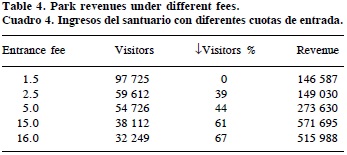 Using the park visitation demand relationship and the calculation of elasticities at each fee level reported above, the revenue-maximizing fees of the sanctuary are shown in Table 4. The landowners obtain $146 587 as revenue when they charge an admission fee of $1.50. The number of visitors for the 2001-2002 season was estimated at 97 725. If the entrance fee were $5.0, they would make $273 630 from visitors. With a $15 fee they would make $571 695, but a $16 fee would raise only $515 988, making less revenue than with a $15 dollar fee. Thus, the optimal fee for landowners is $15 dollars per person (Table 4). Table 4 also shows that a 61% reduction in visitation would take place at a $15 fee, reducing the public enjoyment and education provided by the butterfly reserve.