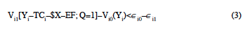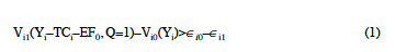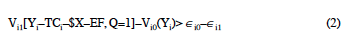 The particular character of tourism makes many traditional valuation techniques difficult or inappropriate to apply for welfare estimations. Some models cannot be used to derive a demand function for the recreational service, since the site is visited only once. However, Hanemann (1984) showed that the problem of Contingent Valuation Method (CVM) discrete choice could be recast as a visit/no visit decision at current trip costs and higher trip costs under a utility difference framework. Consider first the decision to actually visit the site. Let utility of individual i (Ui) be defined as the sum of deterministic (Vi) and random components (∈i); where the ∈i are independent and identically distributed random variable with zero mean that reflects components of the utility function unobservable to an analyst. Let Vij(Yi-TCi-EFo, Q = 1) be the deterministic utility from taking a trip when site quality does not change (i.e. Q=1), where Yi is income, TC is travel cost and EF0 is entry fee. If the individual does not make the trip, the deterministic part of utility is Vi0 (Yi) assuming weak complementarity, that is, site quality does not matter when the site is not visited. If we observe the individual at the recreation site, then the utility difference must satisfy: