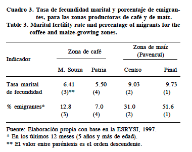 En esta sección se trata de aclarar el contexto del alto nivel de fecundidad para analizar la relación de la fecundidad con la migración temporal en Pavencul. La tasa marital de fecundidad (número de hijos que se supone una mujer casada o unida tendrá en su vida) en Pavencul, es superior a nueve, mientras que en la zona de café, es de 6.4 en M. Souza y 5.5 en Patria con diferencias hasta de tres hijos (Cuadro 3).