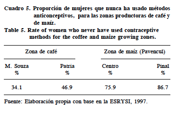 El gobierno mexicano ha instrumentado un programa de planificación familiar (PF) desde la década de 1970, y durante una etapa se promovió y coercitivamente, sobre todo en las zonas rurales junto con las campañas de nutrición y vacunación. Pero en la zona productora de maíz hay pocas mujeres que practican la PF (Salvatierra et al., 2003), mientras que más de la mitad lo hacen en los dos ejidos cafetaleros (Cuadro 5).