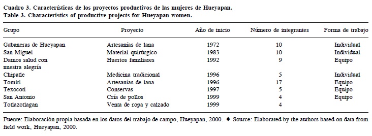 Durante los años noventa se formaron los ocho grupos que se analizan en esta investigación. Los proyectos productivos que se llevaron a cabo fueron muy variados: elaboración de artesanías de lana, conservas, cría de pollos, venta de ropa y calzado, elaboración de medicina tradicional, atención a huertos y elaboración de material quirúrgico. En el Cuadro 3 se muestran las características de los ocho grupos.
