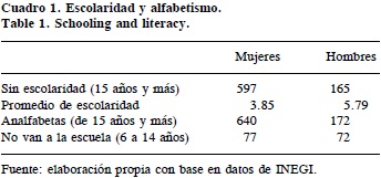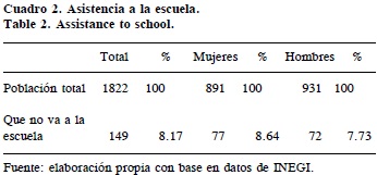 El promedio de escolaridad y el número de personas con educación formal y alfabetizadas es favorable a los varones. Incluso la cantidad de personas que no asisten a la escuela en edad escolar (6 a 14 años) es mayor entre mujeres que entre hombres y en su conjunto corresponden a 8.17% de la población total dentro de este intervalo de edad: 931 hombres y 891 mujeres (Cuadro 2).