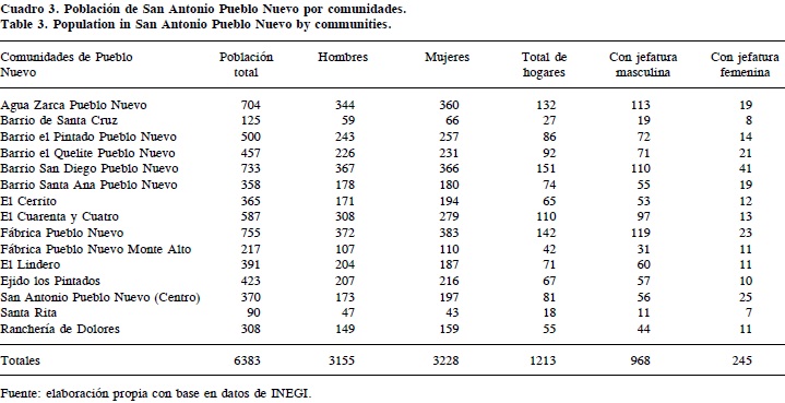 De acuerdo con la información del INEGI (Instituto Nacional de Estadística, Geografía e Informática), en los 15 barrios de la comunidad de Pueblo Nuevo hay 3 228 mujeres (50.58%) y 3 155 hombres (49.42%). Esto implica un incremento importante en la población femenina, ya que el censo de 1990 registró 48.50% de mujeres en la localidad. Este aumento puede ser resultado del incremento en la migración masculina, ya que muchos hombres salen continuamente a trabajar durante diferentes épocas y con estancias de diversa duración. Una característica, sobresaliente de esta comunidad es que tanto mujeres como hombres salen mucho de sus pueblos a trabajar o a vivir, y frecuentemente se establecen de manera más o menos permanente en sitios urbanos.