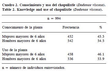 Se observó que el conocimiento de la planta es mayor en los hombres (54.5%). Esto puede deberse a que ellos tienen más contacto con los ambientes de la región y las actividades agrícolas. Así mismo, este grupo es el que utiliza con más frecuencia la planta (53.9%), situación que se relaciona con las actividades que realizan, pues éstos, a partir de los 6 años de edad, participan en actividades agrícolas sencillas (Cuadro 2).