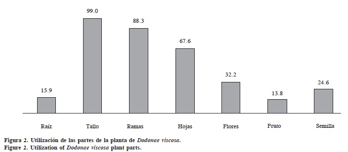 Las partes de la planta más utilizadas por los campesinos de la región son, de mayor a menor uso: el tallo, las ramas, las hojas y las flores; con menor uso de la semilla, la raíz y el fruto (Figura 2). En el caso de los tallos, éstos son básicos para elaboración de tutores, construcción de viviendas y corrales para animales domésticos, para la elaboración de herramientas y como combustible (Cuadro 3).