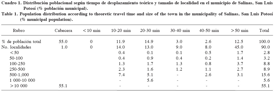 Los 26 000 habitantes del municipio de Salinas se encuentran distribuidos espacialmente en 59 localidades (Cuadro 1), de las cuales sobresale la cabecera municipal con 14 000. Con rangos entre 500 y más de 1000 habitantes se ubicó el 20% de los poblados, entre ellos: La Reforma, Colonia Juárez (Colonias), Salitrillo, Azogueros, Conejillo, Punteros (San José de Punteros) y Palma Pegada). Un hecho relevante es que la distribución poblacional rural (sin la cabecera) es muy dispersa, sobresaliendo que 12.5% de los habitantes invierten hasta 50 minutos para desplazarse a la cabecera municipal.