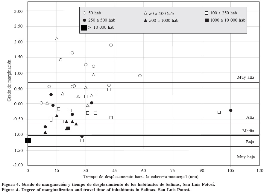En la Figura 4 se muestran los resultados del índice de marginación en relación al tiempo de desplazamiento de las comunidades a la cabecera municipal como centro de provisión de servicios, indicando que aparentemente no existió una relación directa entre el tiempo de desplazamiento y el nivel de marginación.