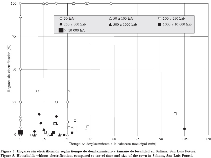 Los resultados sobre electrificación indicaron que los poblados que carecen de energía eléctrica se ubican a diversos tiempos de desplazamiento en el municipio; el denominador común para ello fue una población menor a 100 habitantes (Figura 5). Rosas-Flores et al. (2011), señalan que el consumo de electricidad rural en los hogares se concentra en la conservación de alimentos (53% por refrigerador), entretenimiento (18% por televisión) y cuidado de la ropa (13% por uso de plancha). A este respecto, más de 80% de los hogares del municipio de Salinas de Hidalgo cuentan con electrodomésticos básicos como los mencionados. Sin embargo, un análisis detallado como el de Rosas-Flores et al. (2011), sugiere que la magnitud de la demanda de energía para los hogares, aunado a la lejanía de las comunidades en términos de las redes eléctricas y la voluntad de pago de estas comunidades pequeñas, hace difícil a una empresa invertir en la provisión del servicio. Khandker et al. (2009), señalan un beneficio de 30% a través del mayor tiempo de concentración de los estudiantes en sus actividades académicas como resultado de la electrificación, lo que recuerda la importancia de la energía eléctrica para el desarrollo rural. Kanagawa y Nakata (2008), señalan la utilidad de combinar políticas de gobierno y mercado, a fin de generar proyectos de autogeneración de energía como la solar o eólica, para satisfacer las necesidades de las comunidades más alejadas. Kanagawa y Nakata, (2007), así como Chaurey et al. (2004), resaltan la importancia de que la ausencia de energía eléctrica lleva a los habitantes de comunidades aisladas al empleo de combustibles alternos que ponen en riesgo la salud de las familias, además de tener consecuencias económicas desfavorables por estar fuera de la red de abastecimiento eléctrico. Lo anterior es relevante si se considera que una alternativa futura para abastecer de electricidad a las localidades de Salinas puede ser la autogeneración de energía vía paneles solares, aprovechando la mayor irradiación por su ubicación en áreas del semi desierto.