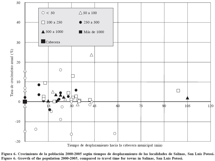 Se analizó la tasa de crecimiento de la población del período 2000-2005 para cada localidad según el tiempo de desplazamiento hacia la cabecera municipal. La tasa de crecimiento es la utilizada por el INEGI (2005) y se expresa como: T_(00-05) = [(P_2005 /P_2000)^(1/5.676)-1]*100; donde T es la tasa anual de crecimiento y P es la población registrada en dos momentos censales y 5.676 es el período transcurrido entre las dos mediciones. Se probó la hipótesis de que las tasas de crecimiento son influenciadas por el tiempo de desplazamiento y el tamaño de población como variables independientes.