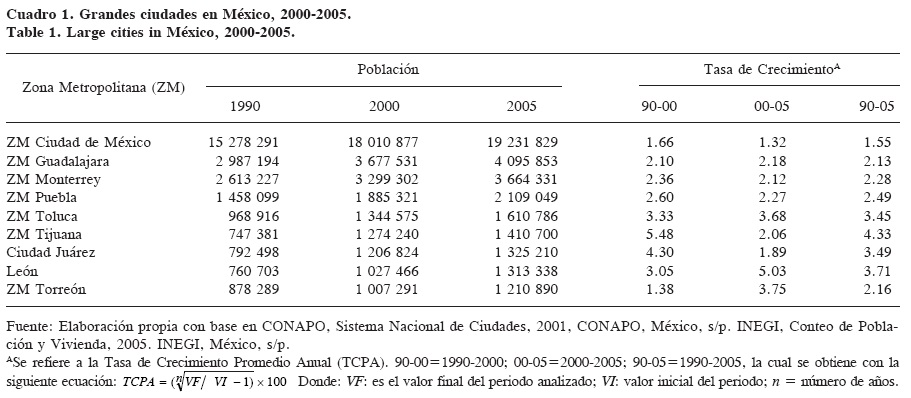 La población se ha concentrado tradicionalmente en cuatro grandes centros urbanos15, las Ciudades de México, Monterrey, Puebla y Guadalajara; aunque a partir del año 2000 surgen cinco nuevas ciudades de gran tamaño (Cuadro 1) que en general son aquellas localidades donde tradicionalmente ha existido una planta productiva.