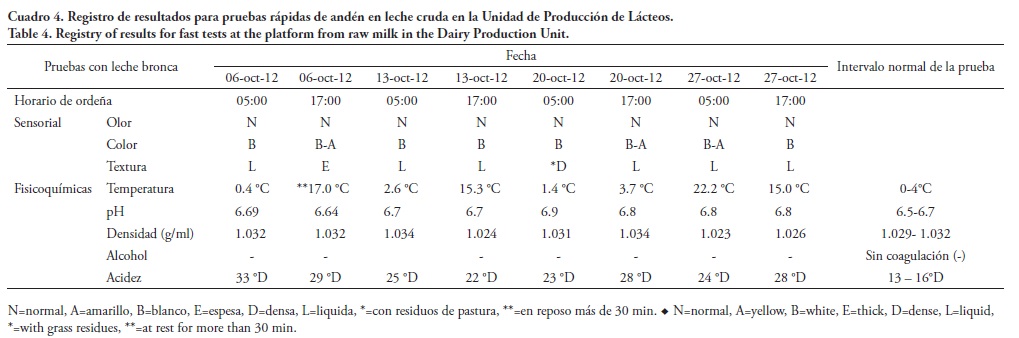 Pruebas rápidas de andén en leche. En lo que refiere al análisis de la calidad de la leche para la transformación de lácteos, se realizaron pruebas sensoriales como olor, color, sabor y textura y pruebas fisicoquímicas, como medición de temperatura, pH, densidad y termoestabilidad (prueba de alcohol).