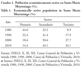 En 1980, 44 % de la Población Económicamente Activa (PEA) se concentraba en el sector primario, 22.5 % en el secundario y 8.9 % en el terciario. Para 1990, 32.4 % de la PEA se localiza en el sector primario, 41.4 % en el sector secundario y 17.9 % en el sector terciario. Para el 2000, el número de PEA disminuye considerablemente en las actividades primarias (-42.6 %), mientras que el mayor porcentaje de PEA se encuentra insertado en sectores de actividad no agrícola, principalmente en el sector secundario. Para 2010 se puede apreciar que la PEA localizada en el sector secundario decrece (-14.8%), mientras que la concentrada en el sector terciario se incrementa (23.1 %) (Cuadro 1).