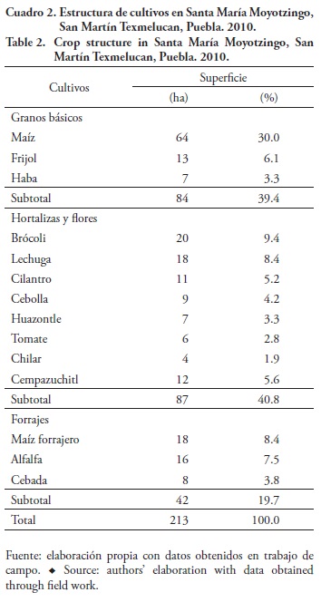 La estructura de producción está dominada particularmente por granos básicos [maíz (Zea mays), frijol (Phaseolus vulgaris) y haba (Vicia faba)], forrajes [alfalfa (Medicago sativa), cebada (Hordeum vulgare) y maíz forrajero (Zea maiz)], hortalizas [brócoli (Brassica oleracea), lechuga (Lactuca sativa), cilantro (Coriandrum sativum), cebolla (Allium cepa), huazontle (Chenopodium nuttalliae), tomate (Solanum lycopersicum) y chile (Capsicum annum)] y por la presencia de flor de cempasúchil (Tagetes erecta). Los granos básicos ocupan la mayor superficie sembrada (77 ha), seguidos de las hortalizas (68.3 ha) y los forrajes (42 ha). Para 62% de las UDC, los cultivos de maíz, frijol y alfalfa son considerados los más importantes por el valor de uso necesario para el autoconsumo, aunque al frijol y a la alfalfa también les confieren un valor económico, ya que con estos cultivos se asegura la alimentación de la UDC y también de la pequeña ganadería (principalmente borregos, aves, cerdos y vacas) que, en su mayoría, es destinada a su comercialización (79 %). Para los agricultores, la crianza de los animales significa "un ahorro" del cual pueden disponer en caso de presentarse una emergencia (Cuadro 2).