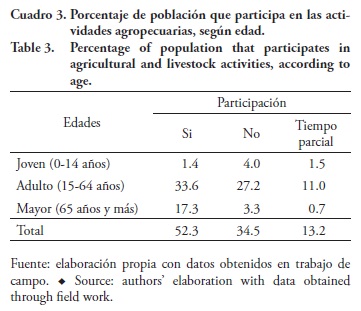 La colaboración de población mayor (64 años y más) en las labores agrícolas es destacable; aunque no se emplea en todas las fases del proceso productivo, sí atiende actividades como desgranado del maíz, fertilización del cultivo, deshierbe, destape del maíz y frijol, entre otras (Cuadro 3). Lo anterior concuerda con lo señalado por el INEGI (2005), al citar que 73 % de la población de 60 años y más se emplea en las actividades agrícolas, mientras que la joven, de 20 a 29 años, participa menos en este sector (Alvarado et al. 2011).