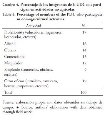 Además de practicar las actividades agrícolas, las UDC de Santa María Moyotzingo también emplean su fuerza de trabajo en actividades económicas no agrícolas o actividades extra-finca, como la industria, el comercio, los servicios, diversos oficios y la maquila, entre otros (Cuadro 4).
