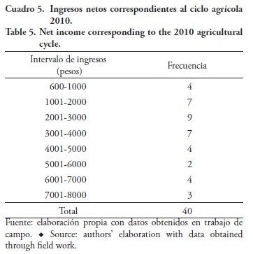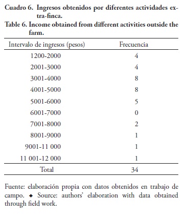En cuanto a los ingresos obtenidos por las actividades extra-finca, se consideró la información proporcionada por 34 productores. Los ingresos mensuales obtenidos van de $3600.00 a $12 000.00. Los agricultores que perciben los mayores ingresos son los que trabajan como técnicos en las industrias (Cuadro 6).