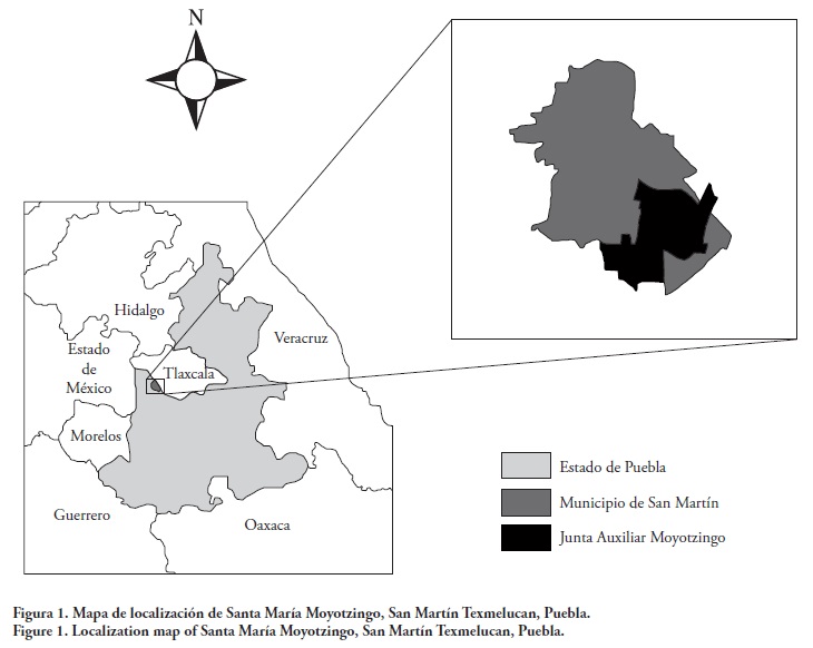 Moyotzingo (composición del idioma náhuatl que significa "lugar de mosquitos" o en "donde están los moyotes"4) es una de las once juntas auxiliares que integran al municipio de San Martín Texmelucan y se localiza a 3.8 km al sur de la cabecera municipal (Figura 1). San Martín Texmelucan se ubica en la parte centro poniente del estado de Puebla, en un área del valle poblano tlaxcalteca conocido como valle de Texmelucan, ubicado a 32 km de la capital poblana, a 26 km de la ciudad de Tlaxcala y a 95 km de la ciudad de México (Contreras, 2001).