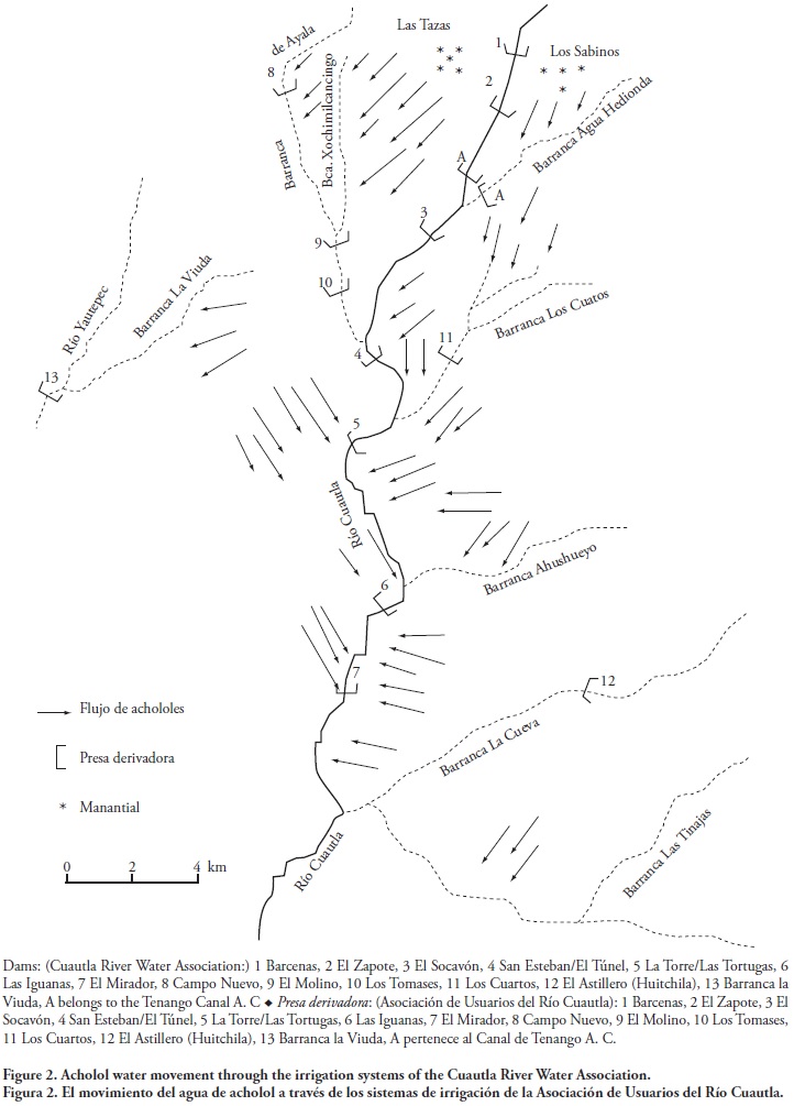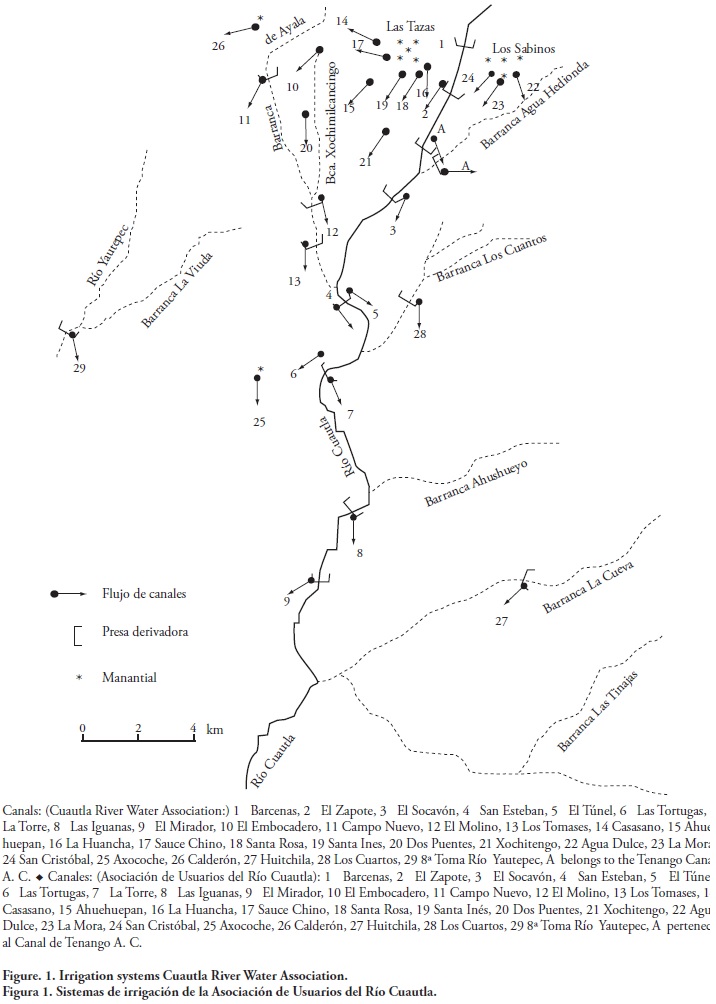 The water users' association of the Cuautla River comprises 29 systems, irrigating some 10 000 hectares and, from the viewpoint of the offtakes, each canal is a discrete irrigation system; however, from the point of view of the acholol water, it is one system, as acholol water flows from one canal-system to another.