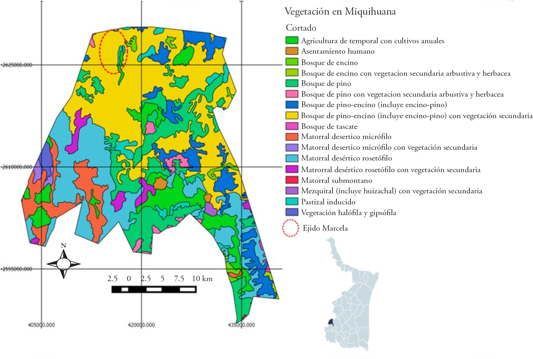 Figura 1 Ubicación y vegetación de Marcela, Miquihuana, Tamaulipas.