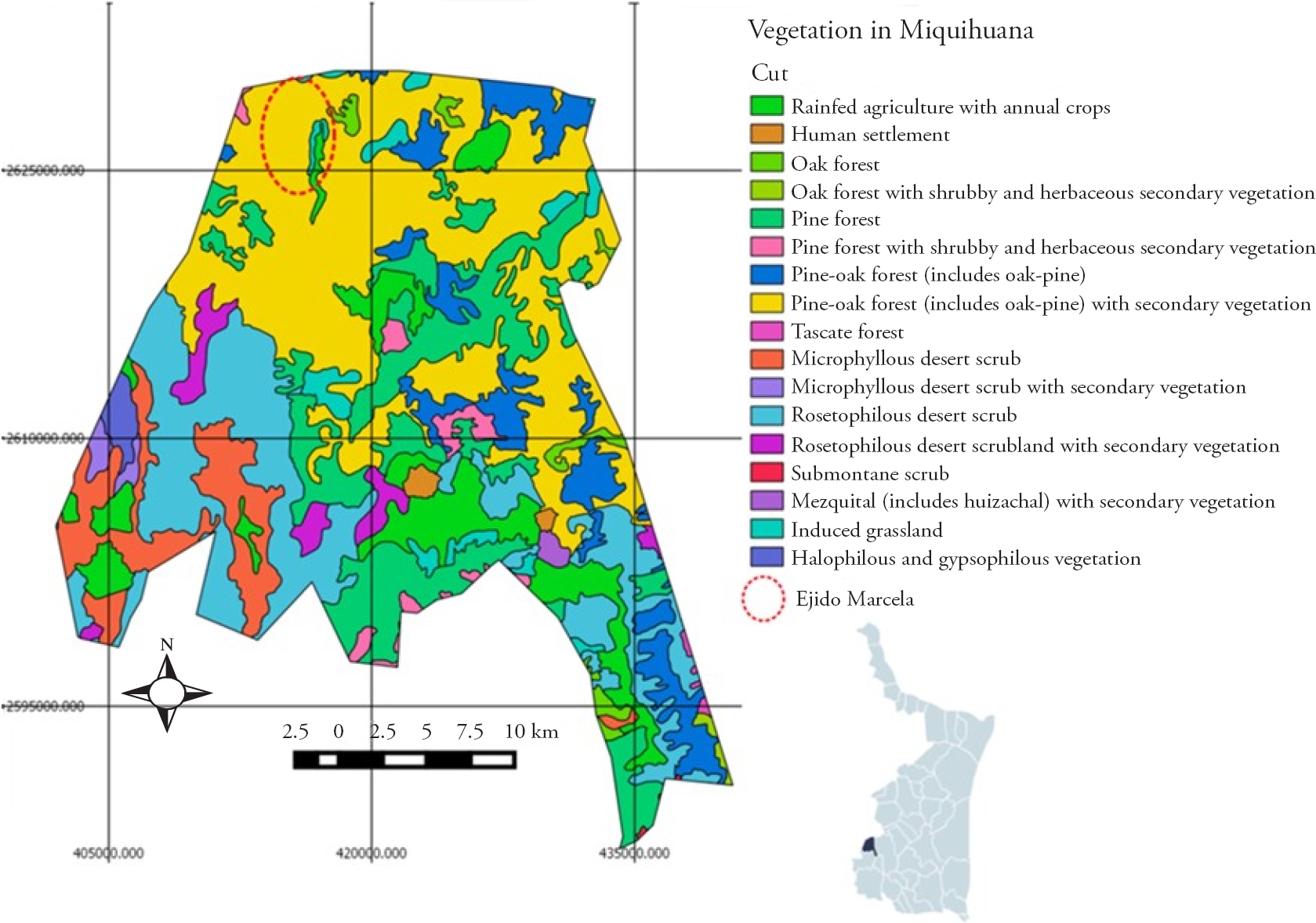 Figure 1 Location and vegetation in Marcela, Miquihuana, Tamaulipas.