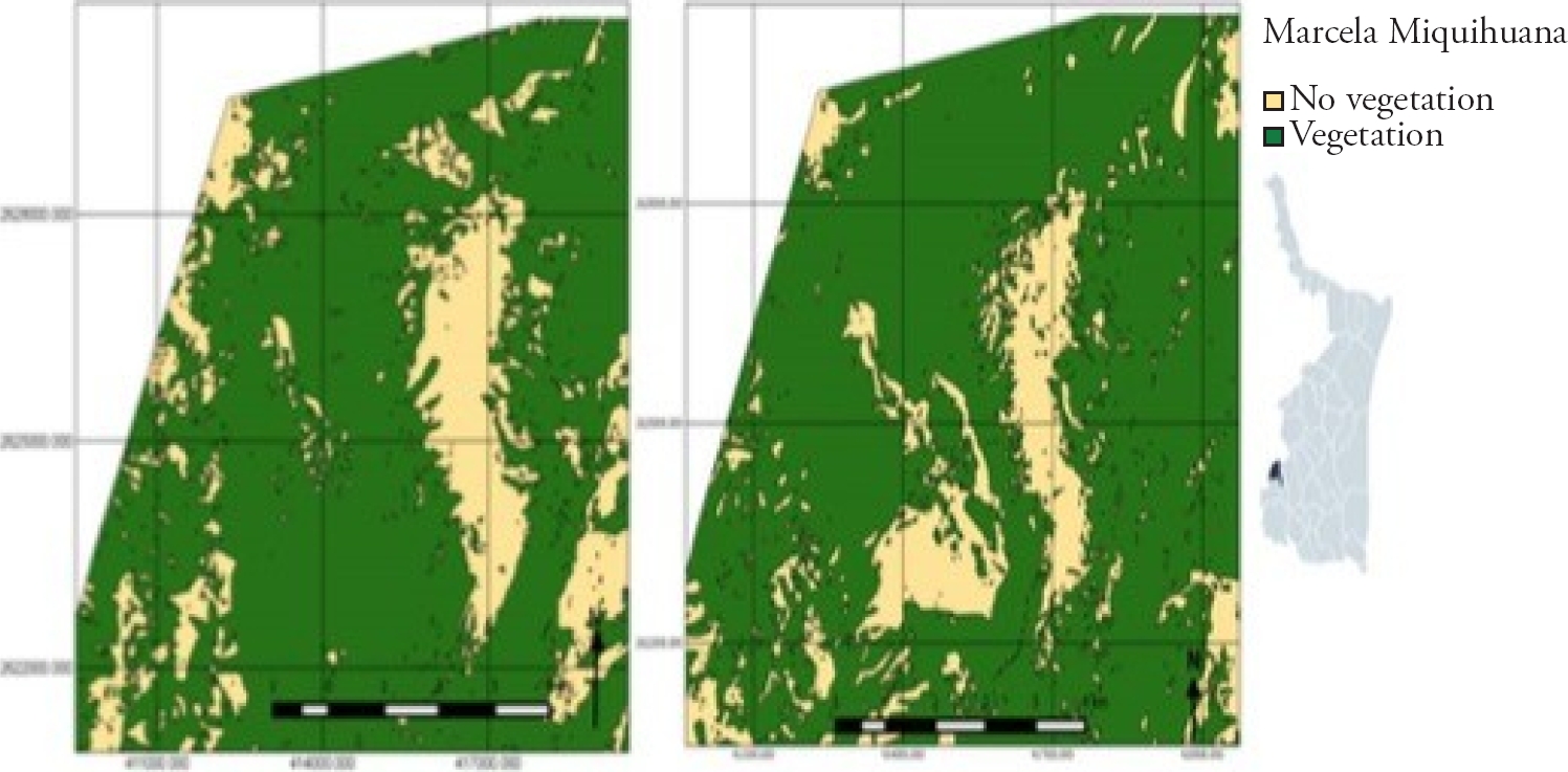 Based in the analysis to obtain the NDVI, the impact in the zones where woody fuels are obtained could be determined, not only on the timber-yielding species, but also on associated species. For the year 2010, a percentage of vegetation of 56.9% was identified regarding the total area of the community, and in the year 2020, a percentage of 49.2% was obtained (Figure 4), which represents a loss of 7.1% of plant coverage in a period of ten years in the study zone; this corroborates the information provided by inhabitants and the recollection sites of the woody material.