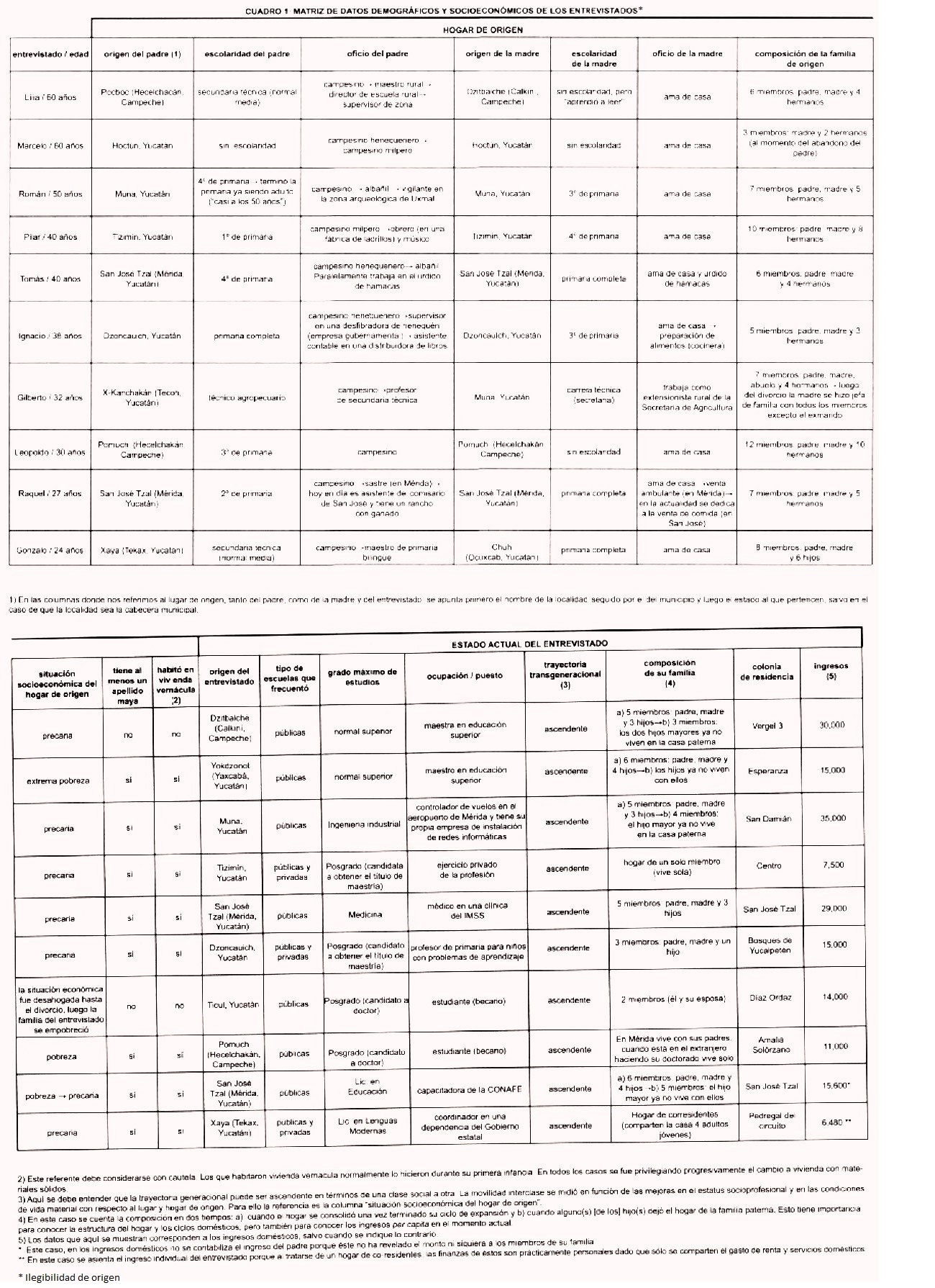 Así pues, en este trabajo nos enfocamos a los casos de movilidad social ascendente que tienen que ver con la escolarización a nivel superior y el desplazamiento geográfico de gente que reivindica su autoadscripción étnica. Omitimos el estudio de casos de ascenso social (que también tenemos registrados) a partir de una identidad encubierta deliberada o de una clara negación del origen étnico, pero ninguna investigación puede obligar a nadie a asumir una identidad que esconde. En tales circunstancias, suponemos que en los censos y encuestas debe haber un importante subregistro del número de mayas, principalmente de aquellos exitosos en el plano socioprofesional, que en zonas urbanas asumen "identidades híbridas" y prácticas múltiples que pueden o no estar disociadas de aquellas que tiene que ver con su origen étnico. Por otro lado, no todos los casos de mayas que han experimentado trayectorias de movilidad geográfica y de clase ha sido por haber estudiado a nivel superior y haber hecho carrera en Mérida. Tenemos registro de procesos de ascenso social gracias a la participación política (afiliación a partidos, sindicatos o por el ejercicio de un cargo) pero también gracias a la recepción de remesas enviadas del extranjero. Estos temas son más complicados de abordar tanto en el plano analítico como en la consecución de evidencia empírica, pero merecen ser estudiados.