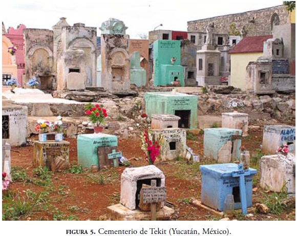 Tanto el gusto por concebir el espacio del cementerio como un lugar de feria en el que toda distracción era posible, como el empleo del osario como forma de enterramiento, fueron, pues, costumbres que estaban en uso en los cementerios de Europa occidental en tiempos de la conquista y durante los primeros siglos de la época colonial hispana, y que posiblemente pasaron a formar parte de los cementerios mayas de nueva planta, sobreviviendo hasta nuestros días. Es ante influencias como éstas que surge la pregunta de por qué estos camposantos no asimilaron también el aspecto acromático y la sobriedad que ya caracterizaba a sus semejantes europeos en el siglo XV y XVI. La respuesta es simple: esta estética plomiza, acorde con la idea de ruptura y desarraigo de la vida terrenal con la que empezó a concebirse la muerte en Europa occidental a partir de esos momentos, estaba lejos de poder transmitir la proximidad con la que el hombre maya de ayer y de hoy entiende el fenómeno de la muerte, razón por la que la preocupación que la Iglesia intentó inculcar en estos territorios por el destino individual post-mortem apenas cuajó entre sus habitantes.4 en otras palabras, el maya de ayer entendió la muerte a la luz de un sentimiento de cotidianeidad, no exento de ritual, que necesitó el color para poder expresarse tal cual era, aspecto que ha prevalecido hasta la época actual.