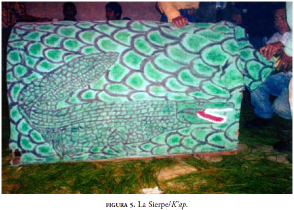 Entre la medianoche y la una de la madrugada se da de cenar14 y media hora más tarde ya están listos la Sierpe y los danzantes. Se saca del templo a la Sierpe/ K'ap para comenzar con su bendición; la colocan a la derecha del rezador entre el hoyo y la iglesia, y el especialista con el auxilio de su ayudante oficia una ceremonia especial para la Sierpe, que dura más o menos una hora. Luego, bendice de nuevo a músicos y danzantes. Al terminar, comienzan a bailar. Son cerca de las 2:30 de la madrugada.