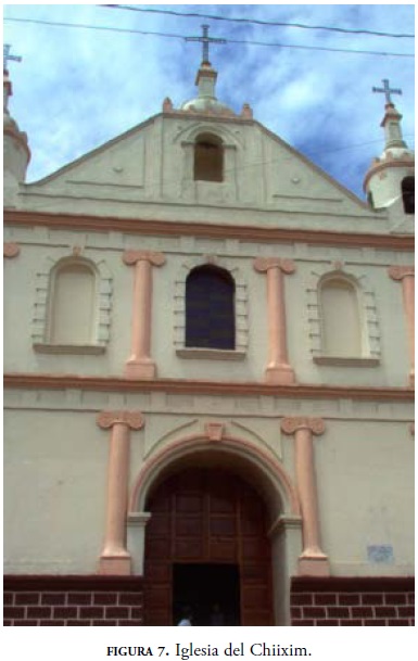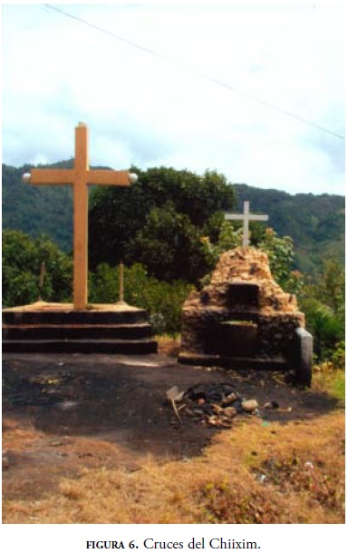 Como a las 3:15 las mujeres empiezan a retirarse de la ermita pues, dicen, "es el costumbre que sólo los hombres suban al Chiixim" (figuras 6 y 7), refiriéndose a la iglesia que se encuentra en lo alto del cerro del mismo nombre. Los hombres comienzan a prepararse y todos, en camionetas, ascienden a la iglesia: "suben [al Chiixim] para velar las máscaras. La ceremonia se hace donde está la cruz. Toman, rezan, a la máscara le riegan licor para bendecirla y bailan frente de la iglesia. Van dos sacerdotes" (Buc Chok).