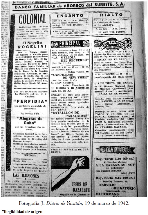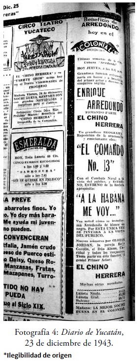 Es de señalar que varios actores cubanos interpretaron con éxito el personaje del negrito en Mérida y en otras partes de Yucatán:10 Arquímedes Pous, Alfonso Rogelini, Enrique Arredondo, entre otros (Foto 3). El primero participó en numerosas giras internacionales de gran éxito y pasó parte del año 1919 en Mérida. En reiteradas ocasiones durante el mes de abril, la Revista de Yucatán se refirió a la "triunfal temporada de la Gran Compañía de zarzuela Cubana Arquímedes Pous" en el Teatro Olimpia. Este actor no sólo interpretaba obras del repertorio cubano, si no también otras que se inspiraban directamente en la realidad mexicana: "Mérida carnaval", "Yucatán souvenir", "De México vengo", escritas y compuestas en el mismo Yucatán, con personajes y acontecimientos que aludían a la sociedad de Mérida. Otras obras estaban dedicadas de manera más directa a las poblaciones negras y mulatas, como por ejemplo las tituladas "Las mulatas de Bam-Bay" y "El brillante negro".