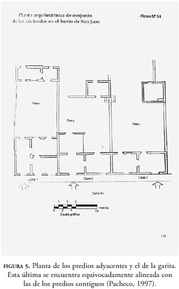 El predio que estudiamos36 está marcado con el número 560 de la calle 64, en el barrio de San Juan (Ilus. 3). Hoy día el terreno exhibe 12.56 m de frente por 44.05 m de fondo y, con base en la legislación vigente, fue declarado Monumento Histórico el 8 de octubre de 1982.37 En su fachada ostenta una placa que apunta que es "Patrimonio de la Nación", sin embargo, esa denominación no se debe al tema que ahora tratamos, sino exclusivamente a la antigüedad del predio y como parte representativa del tejido urbano de una época.
